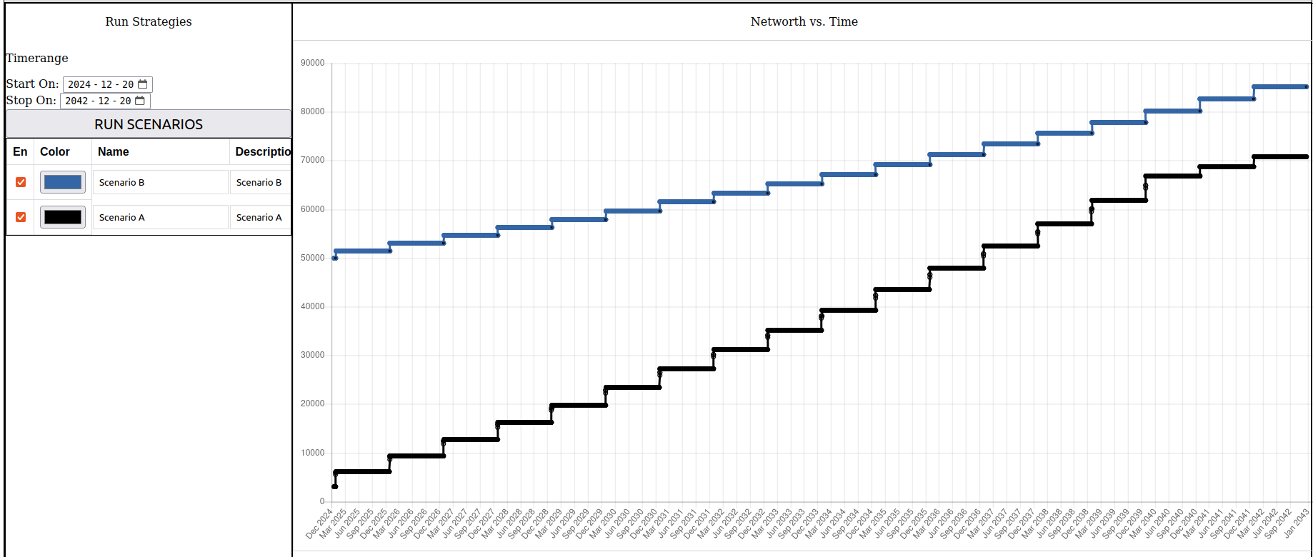 Experiment freely with different scenarios. Observe how your net worth and cash flow are impacted. Your data is securely stored anonymously on our server.